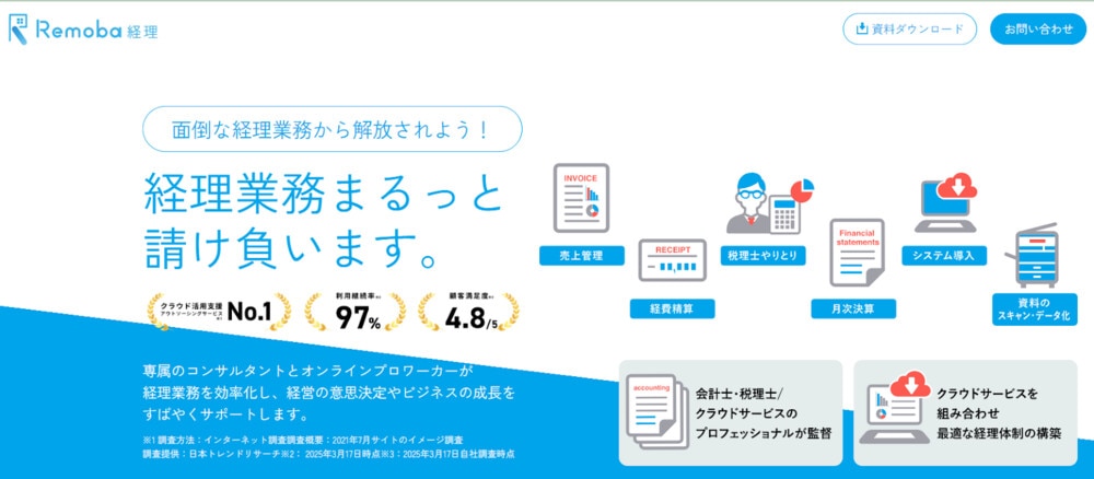 Remoba経理は、「クラウド活用支援アウトソーシングサービスNo.1」を謳う経理代行サービスです。