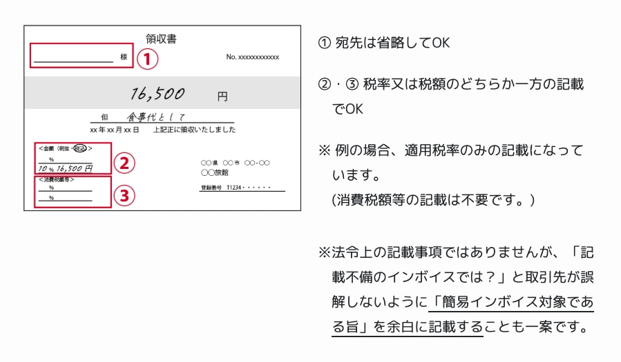 通常のインボイスより記載事項が少なく、必須項目は下記の4つです。日常的に多数の顧客にレシートや領収書を発行する業種でも、インボイス制度に対応できるよう配慮されています。
