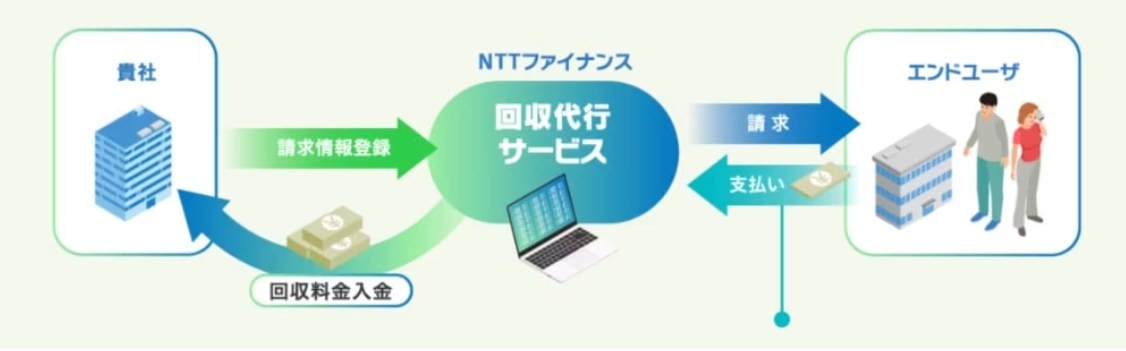 例えばNTTファイナンスの「回収代行サービス」は、NTTファイナンスが事業者さまにかわって顧客(エンドユーザ)へ請求を行うサービスです。
