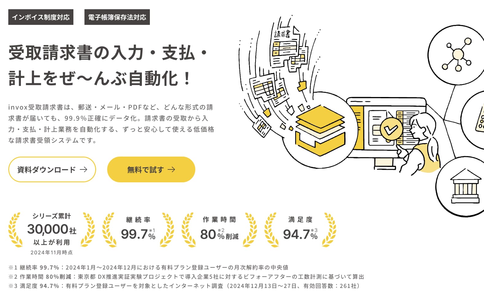 導入企業の継続率が99.7%を誇る、invox受取請求書の紹介です。どのような形式の請求書が届いても、高精度でデータ化できるサービスです。