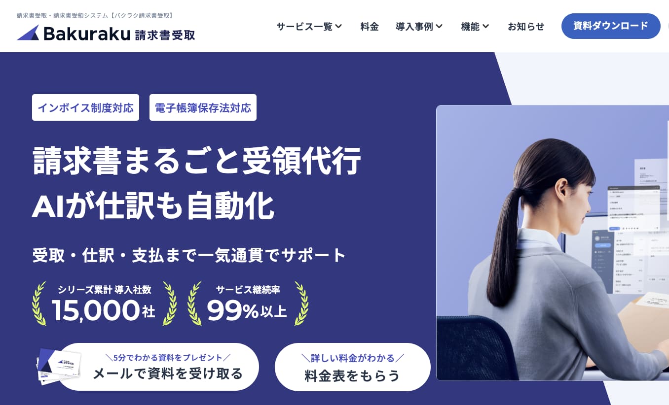 バクラク請求書受取は、シリーズ累計15,000社以上の導入数を誇る請求書受領ソフトです。郵送先をバクラクに変更するだけで、スキャン・データ化・原本保管までを代行してくれます。