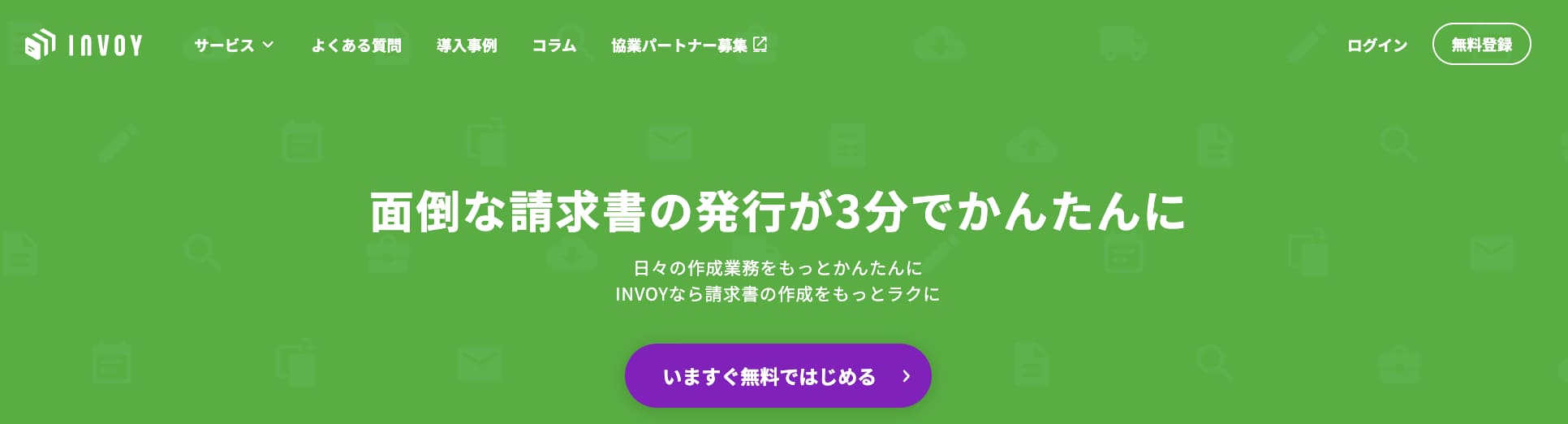 INVOYは、請求書発行から受取・支払いまで簡単に作業できるシステムです。請求書の作成では、必要な項目を上から順番に入力するだけで無料で請求書発行が簡単にできます。