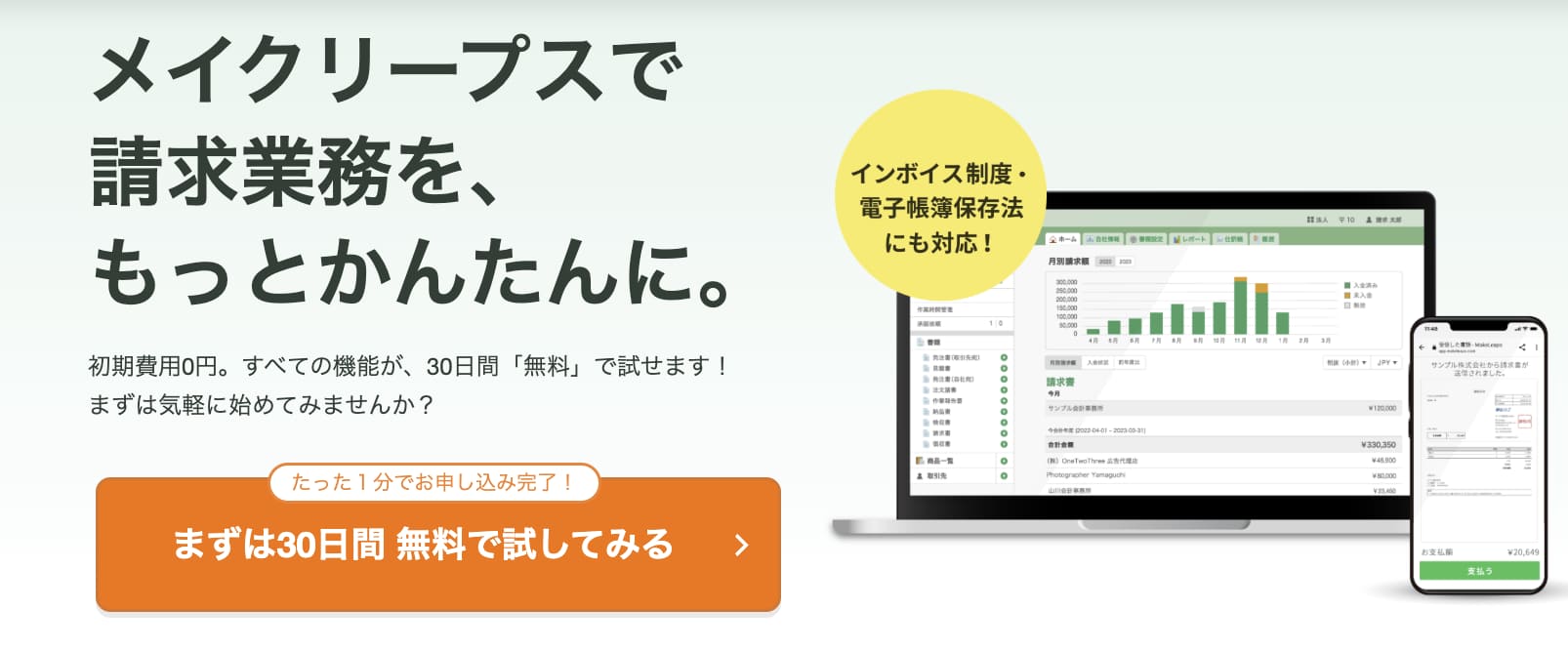 MakeLeapsは、見積書・請求書・入金管理まで、経理・請求業務をオンラインで一元管理するツールで、30日間無料トライアルが可能です。有料プランすべての機能が30日間無料で使えるので、自分に合うかどうかを試せる貴重なサービスといえます。見積書と請求書の作成およびメールと郵送(※)による送付が可能です。