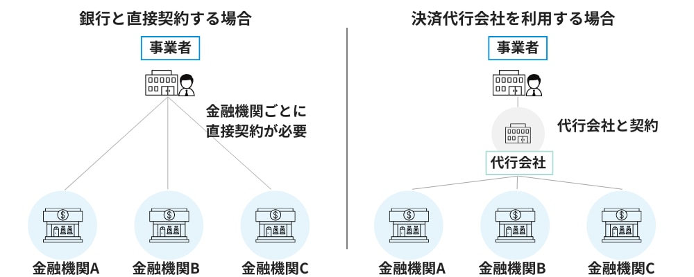 多くの顧客を抱えている場合、顧客が支払いを希望する金融機関がバラバラなケースもよくみられます。幅広い金融機関での支払いに対応したい場合は、金融機関との直接契約よりも決済代行会社が提供する口座自動振替代行サービスの利用がおすすめです。