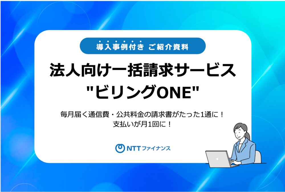 なお、支払業務を効率化し担当者の負担を軽減できるのがNTTファイナンスの「法人"ビリングONE"」です。毎月バラバラに届く通信費や公共料金の請求書を1通にまとめることで、支払いが月1回になり、手作業による工程を大幅に削減できます。詳細は、下記のバナーをクリックのうえ資料をダウンロードしてご覧ください。