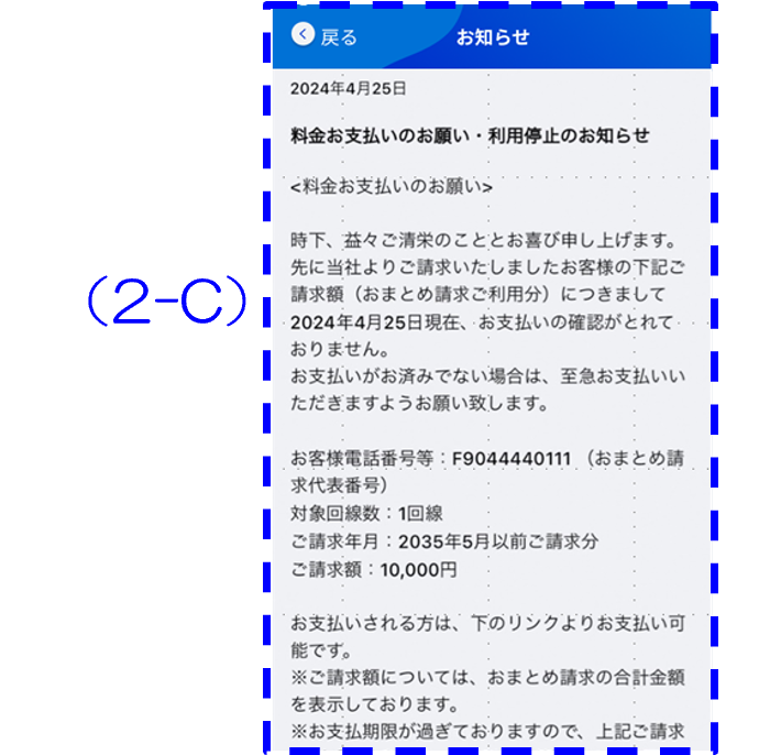 「お知らせ」 →システムメンテナンス情報やお支払い期限超過等のお知らせを通知します。