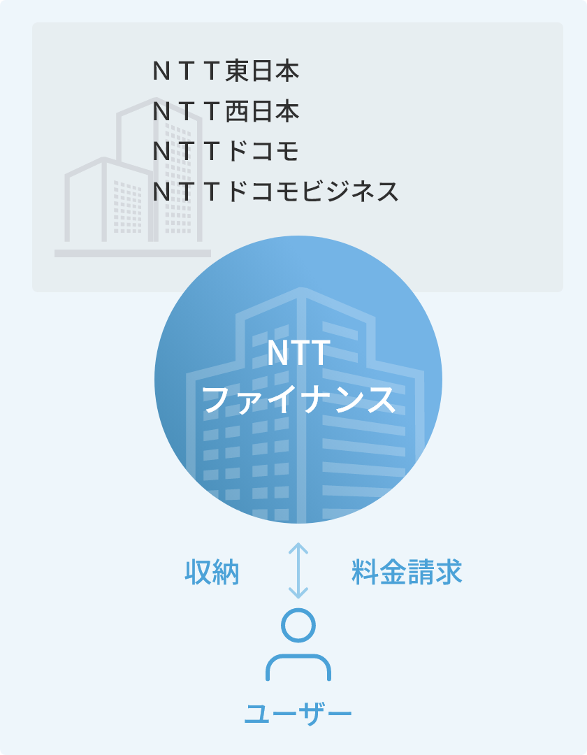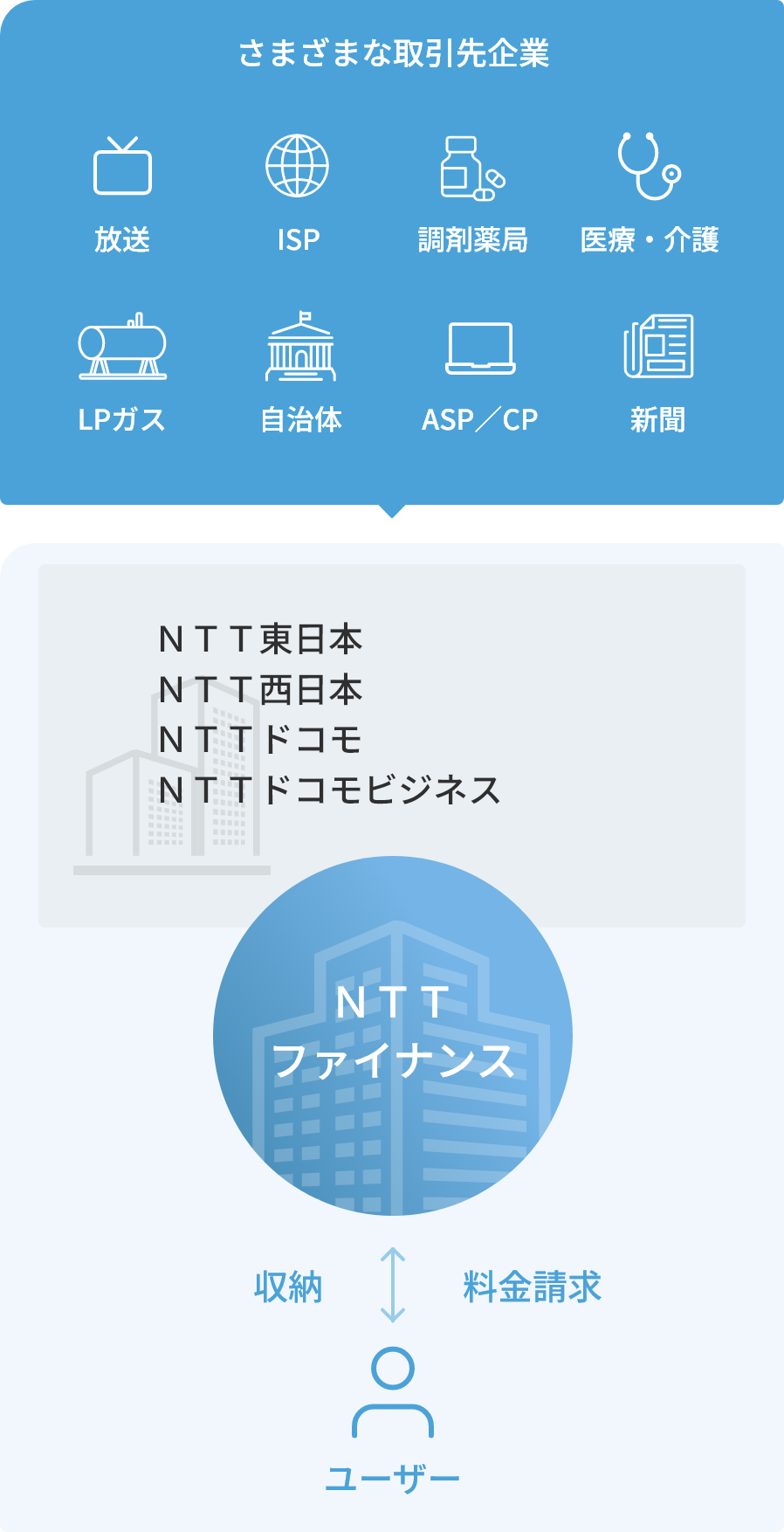 NTT東日本、NTT西日本、NTTドコモ、NTTドコモビジネス。グループ4社の料金請求と収納業務を一元化。ケタ違いのユーザー数と年間取扱金額を誇るプラットフォームは、決済の新たなインフラと呼べるほどの規模です。